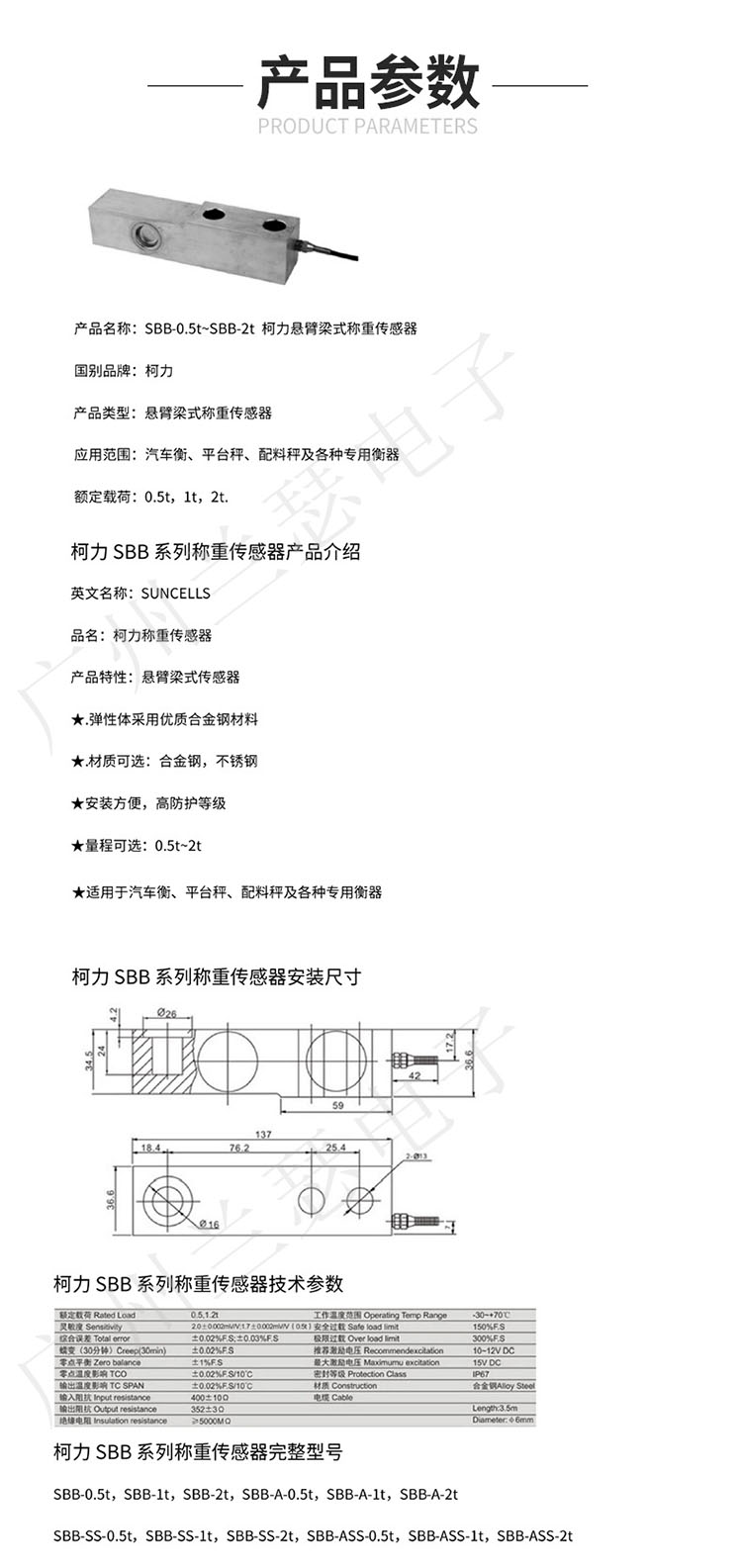 寧波柯力 SBB稱重傳感器產(chǎn)品參數(shù):