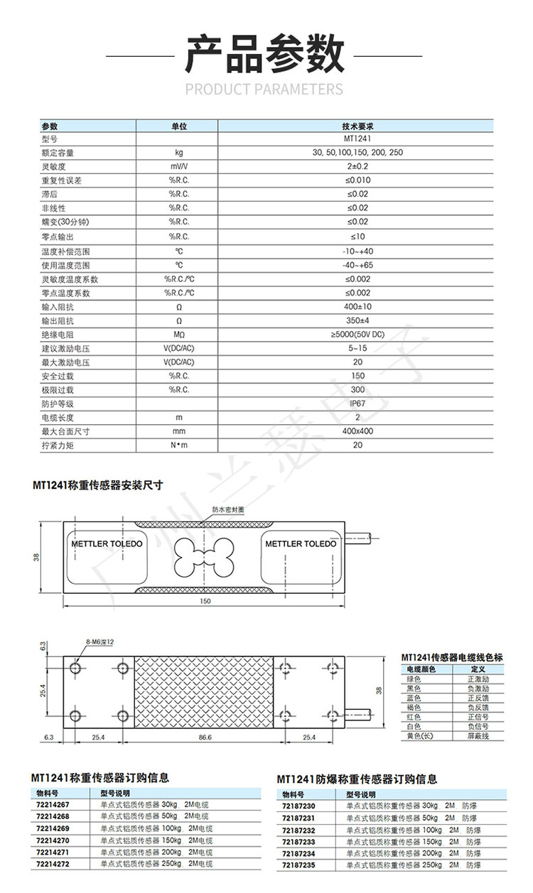 注:MT1241-30是梅特勒-托利多傳感器中容量為30kg,那么型號就是MT1241-30。以止類推得到MT1241系列的所有型號。
