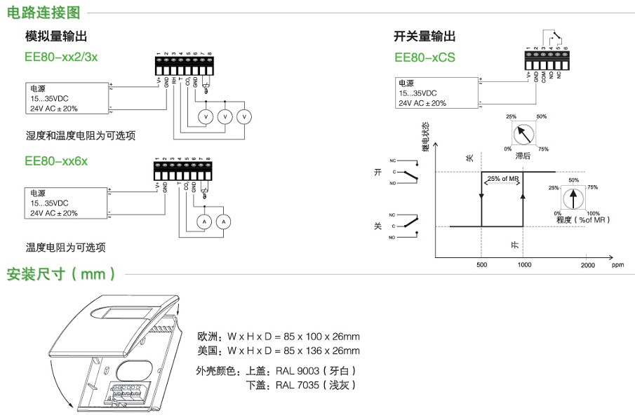 儀表外形設計美觀、安裝簡便,CO2輸出信號為標準的4-20mA或0-5/10V DC信號。根據(jù)用戶的需求,EE80 還可輸出相對濕度和溫度信號,并提供可設定報警點和回差點的開關信號輸出方式。多種的型號能滿足用戶的不同要求,所有EE80 系列變送器都可以配置清晰的液晶顯示模塊用以現(xiàn)場的參數(shù)顯示。