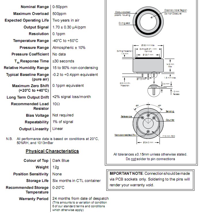 CiTiceL電化學氣體傳感器是密封元件,在正常使用下沒有化學危險性。