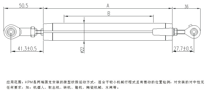 KPM微型絞接電子尺,有效行程75mm1000mm,兩端均有4mm緩沖行程,精度0.05%0.04%FS。外殼表面陽極處理,防腐蝕;內置導電塑料測量單元,無溫漂,壽命長;具有自動電氣接地功能。KPM微型絞接位移傳感器可適用在大多數通用場合,特別適用產品本體不能固定,擺動運動的場合,無需對中;允許極限運動速度:垂直安裝時為10m/s,水平安裝時為3m/s
