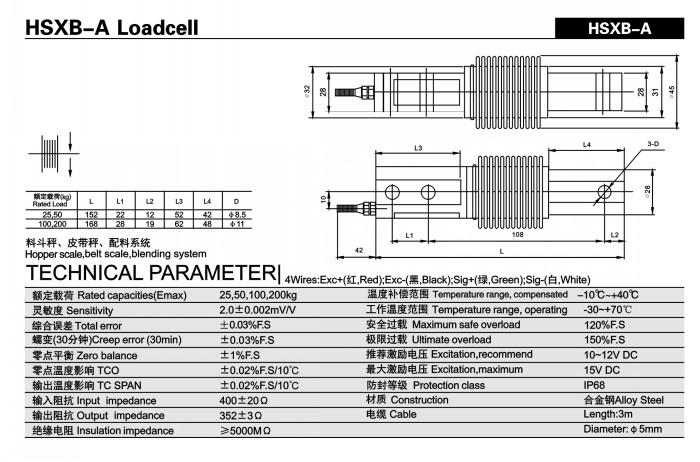美國SUNCELLS HSXB-A-100KG稱重傳感器中文參數:
